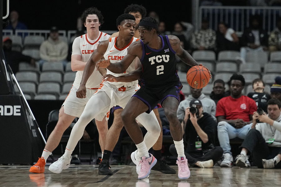Dec 9, 2023; Toronto, Ontario, CAN; TCU Horned Frogs forward Emanuel Miller (2) drives against Clemson Tigers forward RJ Godfrey (10) during the second half at Coca-Cola Coliseum. Mandatory Credit: John E. Sokolowski-USA TODAY Sports