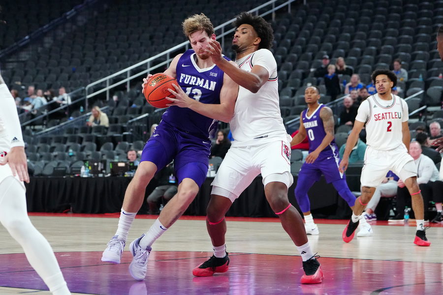 Nov 26, 2024; Las Vegas, NV, USA; Furman Paladins forward Garrett Hien (13) drives against Seattle Redhawks forward Malek Gomma (8) during the second half at T-Mobile Arena. Mandatory Credit: Stephen R. Sylvanie-Imagn Images