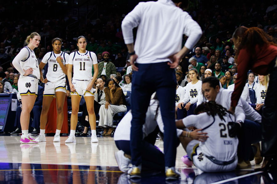Notre Dame forward Kate Koval (13), guard Cassandre Prosper (8) and guard Sonia Citron (11) watch as forward Liatu King (20) receives attention after hitting the ground hard during a NCAA women’s basketball game against James Madison at Purcell Pavilion on Tuesday, Nov. 13, 2024, in South Bend.
