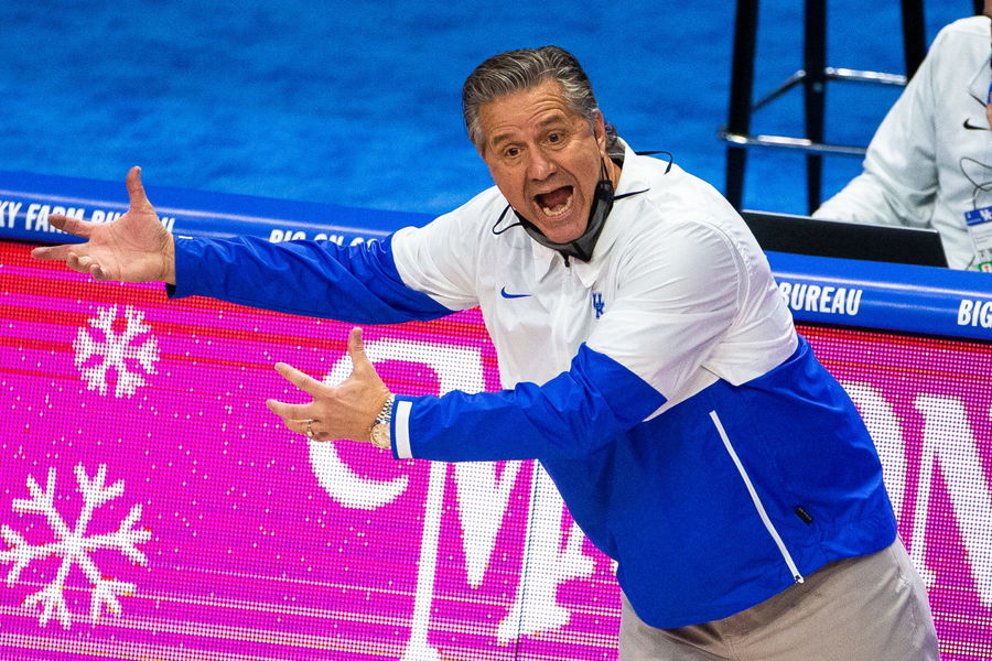 Nov 29, 2020; Lexington, Kentucky, USA; Kentucky Wildcats head coach John Calipari talks with an official during the first half against the Richmond Spiders at Rupp Arena at Central Bank Center. Mandatory Credit: Jordan Prather-USA TODAY Sports