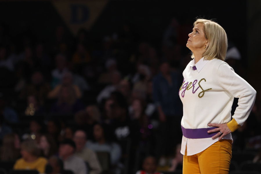 NASHVILLE, TN – FEBRUARY 08: LSU Lady Tigers head coach Kim Mulkey looks at the scoreboard during a game between the Vanderbilt Commodores and LSU Lady Tigers, February 8, 2024 at Memorial Gymnasium in Nashville, Tennessee.Photo by Matthew Maxey/Icon Sportswire COLLEGE BASKETBALL: FEB 08 Women s – LSU at Vanderbilt EDITORIAL USE ONLY Icon24020737