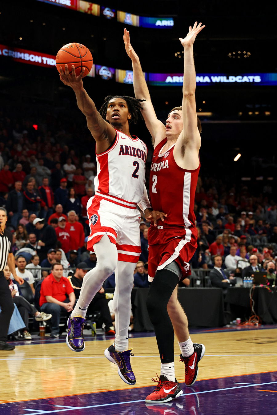 Dec 20, 2023; Phoenix, Arizona, USA; Arizona Wildcats guard Caleb Love (2) shoots the ball against Alabama Crimson Tide forward Grant Nelson (2) during the second half in the Hall of Fame Series at Footprint Center. Mandatory Credit: Mark J. Rebilas-USA TODAY Sports
