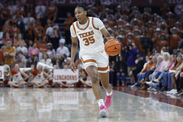 AUSTIN, TX – FEBRUARY 16: Texas Longhorns forward Madison Booker 35 dribbles up the court against the LSU Lady Tigers during the game on February 16, 2025, at the Moody Center in Austin, TX. Photo by Adam Davis/Icon Sportswire COLLEGE BASKETBALL: FEB 16 Womens – LSU at Texas EDITORIAL USE ONLY Icon2502163029