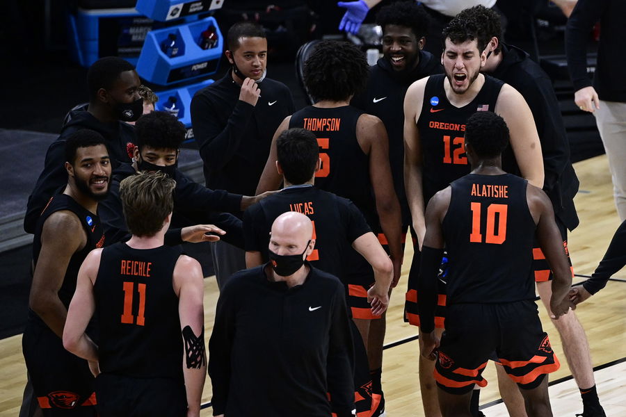 Mar 27, 2021; Indianapolis, IN, USA; The Oregon State Beavers bench reacts during a time out in the second half during the Sweet 16 of the 2021 NCAA Tournament at Bankers Life Fieldhouse. Mandatory Credit: Marc Lebryk-USA TODAY Sports