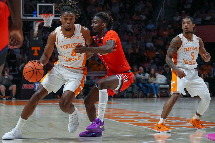 Tennessee guard Chaz Lanier (2) runs around UT Martin guard Tarence Guinyard (1) during an NCAA basketball game between the Tennessee Volunteers and UT Martin Skyhawks at Thompson-Boling Arena at Food City Center on Wednesday, Nov. 27, 2024.