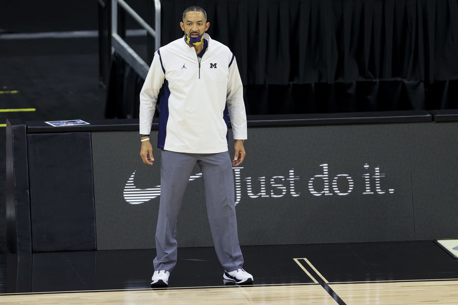 Mar 12, 2021; Indianapolis, Indiana, USA; Michigan Wolverines head coach Juwan Howard reacts from the sideline in the game against the Maryland Terrapins in the first half at Lucas Oil Stadium. Mandatory Credit: Aaron Doster-USA TODAY Sports