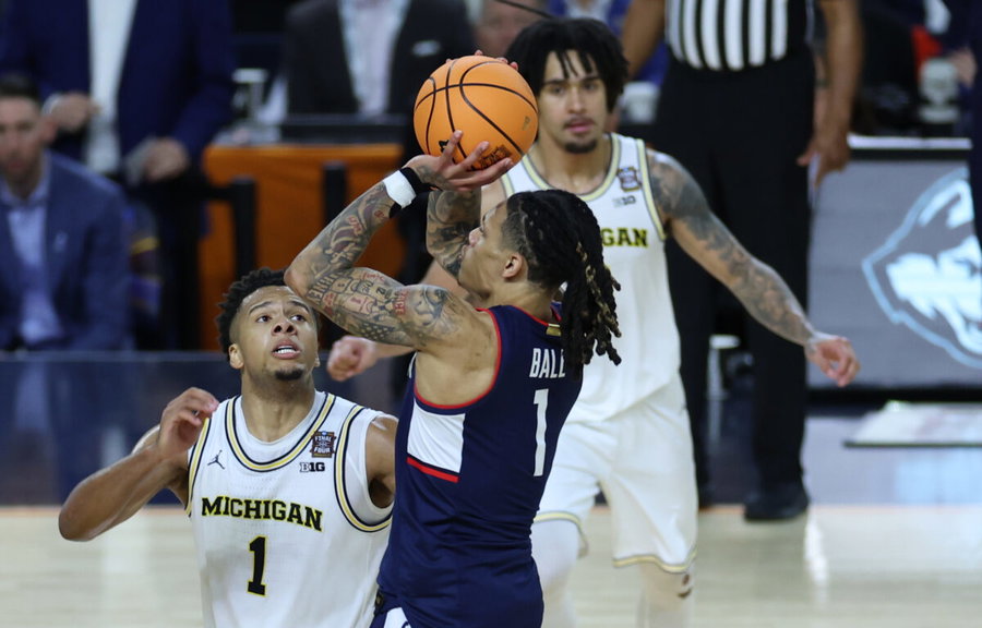 Apr 6, 2026; Indianapolis, IN, USA; UConn Huskies guard Solo Ball (1) makes a three-point basket over Michigan Wolverines guard Trey McKenney (1) in the second half during the national championship of the Final Four of the men’s 2026 NCAA Tournament at Lucas Oil Stadium. Mandatory Credit: Trevor Ruszkowski-Imagn Images
