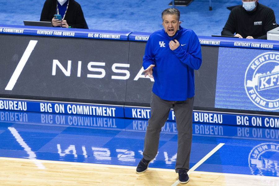 Feb 9, 2021; Lexington, Kentucky, USA; Kentucky Wildcats head coach John Calipari coaches from the sidelines during the second half of the game against the Arkansas Razorbacks at Rupp Arena at Central Bank Center. Mandatory Credit: Arden Barnes-USA TODAY Sports
