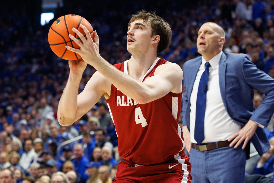 Jan 18, 2025; Lexington, Kentucky, USA; Alabama Crimson Tide forward Grant Nelson (4) shoots the ball during the first half against the Kentucky Wildcats at Rupp Arena at Central Bank Center. Mandatory Credit: Jordan Prather-Imagn Images