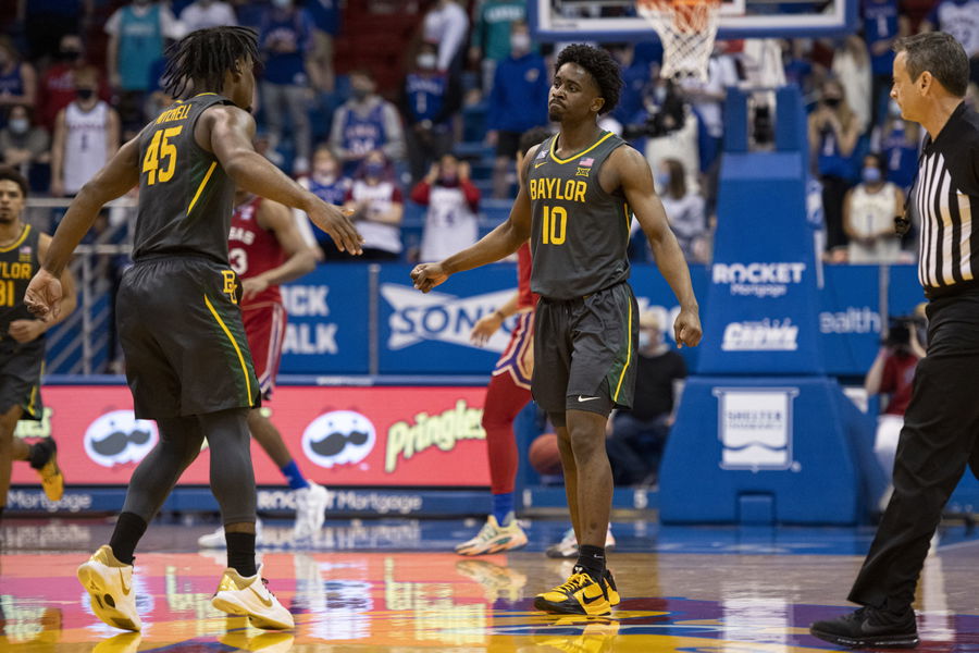 Feb 27, 2021; Lawrence, Kansas, USA; Baylor Bears guard Davion Mitchell (45) high fives Baylor Bears guard Adam Flagler (10) after a play against the Kansas Jayhawks in the first half at Allen Fieldhouse. Mandatory Credit: Amy Kontras-USA TODAY Sports