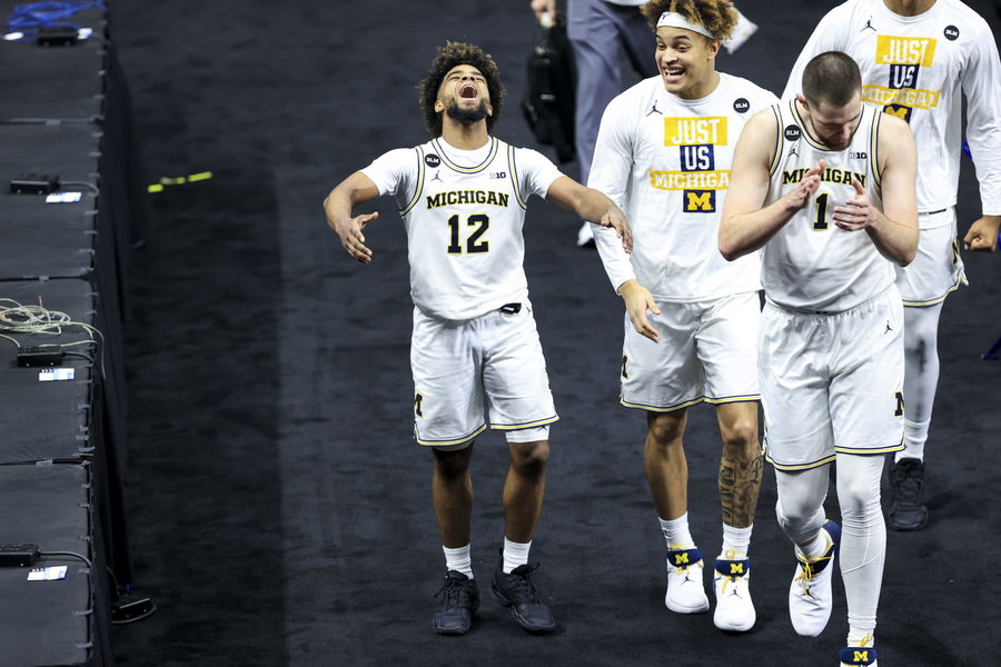 Mar 12, 2021; Indianapolis, Indiana, USA; Michigan Wolverines guard Mike Smith (12) reacts as he walks off the court with teammates after defeating the Maryland Terrapins at Lucas Oil Stadium. Mandatory Credit: Aaron Doster-USA TODAY Sports
