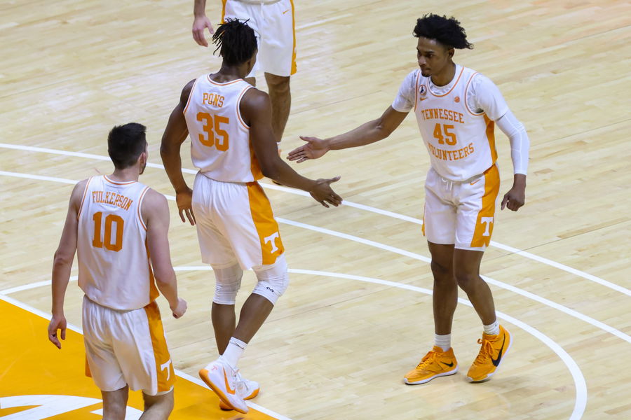 Jan 26, 2021; Knoxville, Tennessee, USA; Tennessee Volunteers guard Yves Pons (35) and guard Keon Johnson (45) reacts to a play against the Mississippi State Bulldogs during the first half at Thompson-Boling Arena. Mandatory Credit: Randy Sartin-USA TODAY Sports