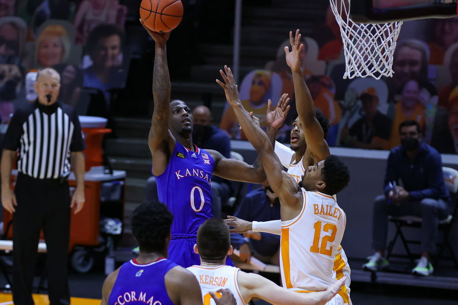 Jan 30, 2021; Knoxville, Tennessee, USA; Kansas Jayhawks guard Marcus Garrett (0) shoots the ball against Tennessee Volunteers guard Victor Bailey Jr. (12) during the second half at Thompson-Boling Arena. Mandatory Credit: Randy Sartin-USA TODAY Sports