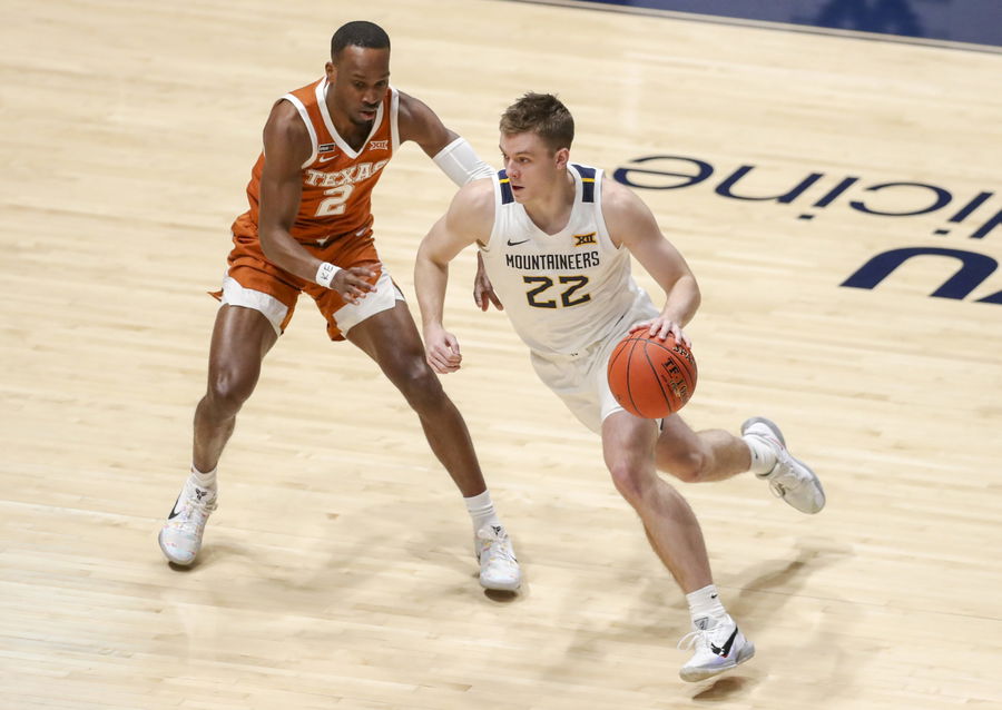 Jan 9, 2021; Morgantown, West Virginia, USA; West Virginia Mountaineers guard Sean McNeil (22) dribbles past Texas Longhorns guard Matt Coleman III (2) during the first half at WVU Coliseum. Mandatory Credit: Ben Queen-USA TODAY Sports