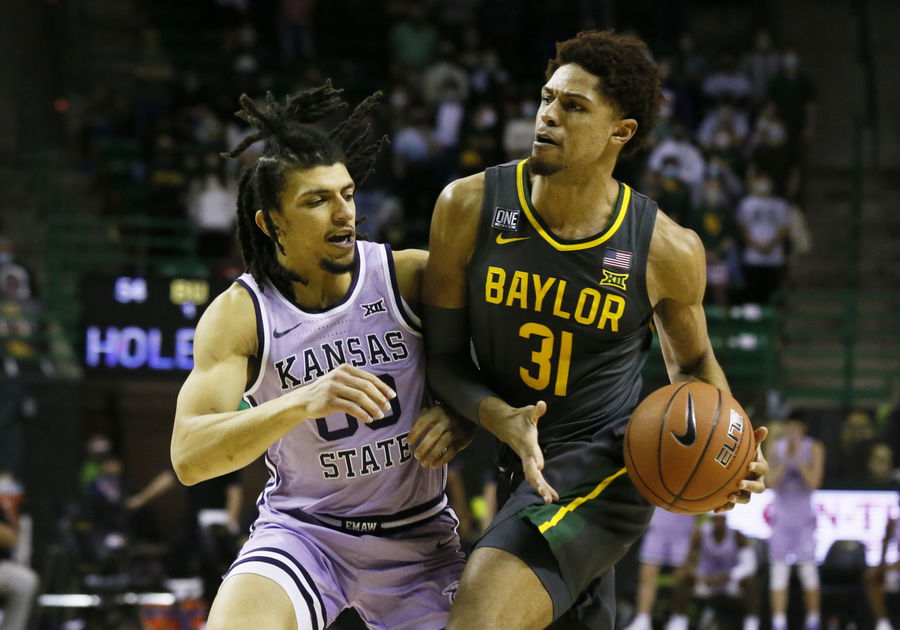 Jan 27, 2021; Waco, Texas, USA; Baylor Bears guard MaCio Teague (31) drives on Kansas State Wildcats guard Mike McGuirl (00) during the second half at Ferrell Center. Mandatory Credit: Raymond Carlin III-USA TODAY Sports