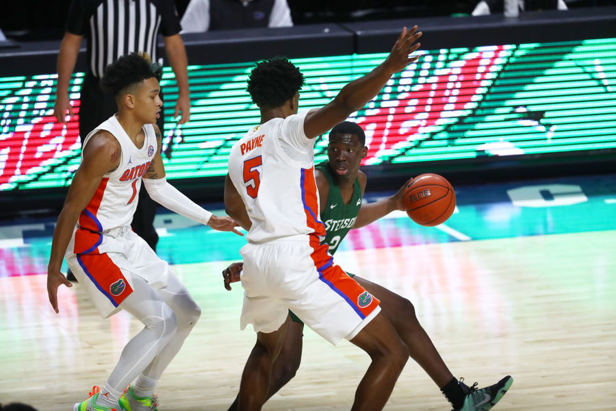 Dec 6, 2020; Gainesville, Florida, USA;Florida Gators guard Tre Mann (1) and Florida Gators forward Omar Payne (5) defend Stetson Hatters guard Rob Perry (2) during the first half at Billy Donovan Court at Exactech Arena. Mandatory Credit: Kim Klement-USA TODAY Sports