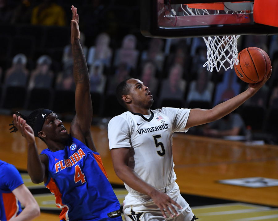 Dec 30, 2020; Nashville, Tennessee, USA; Vanderbilt Commodores guard D.J. Harvey (5) scores past Florida Gators forward Anthony Duruji (4) during the first half at Memorial Gymnasium. Mandatory Credit: Christopher Hanewinckel-USA TODAY Sports