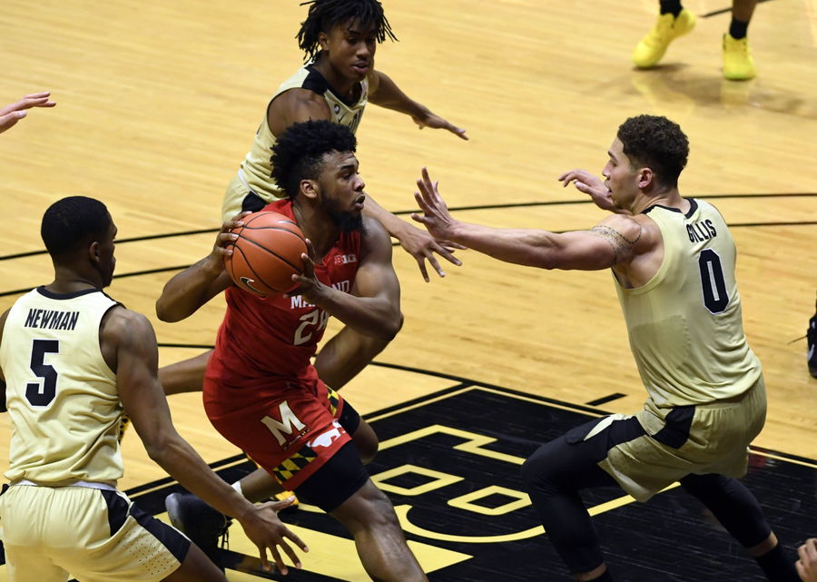 Dec 25, 2020; West Lafayette, Indiana, USA; Maryland Terrapins forward Donta Scott (24) drives the ball toward the basket during the second half of the game at Mackey Arena. The Purdue Boilermakers defeated the Maryland Terrapins 73 to 70. Mandatory Credit: Marc Lebryk-USA TODAY Sports