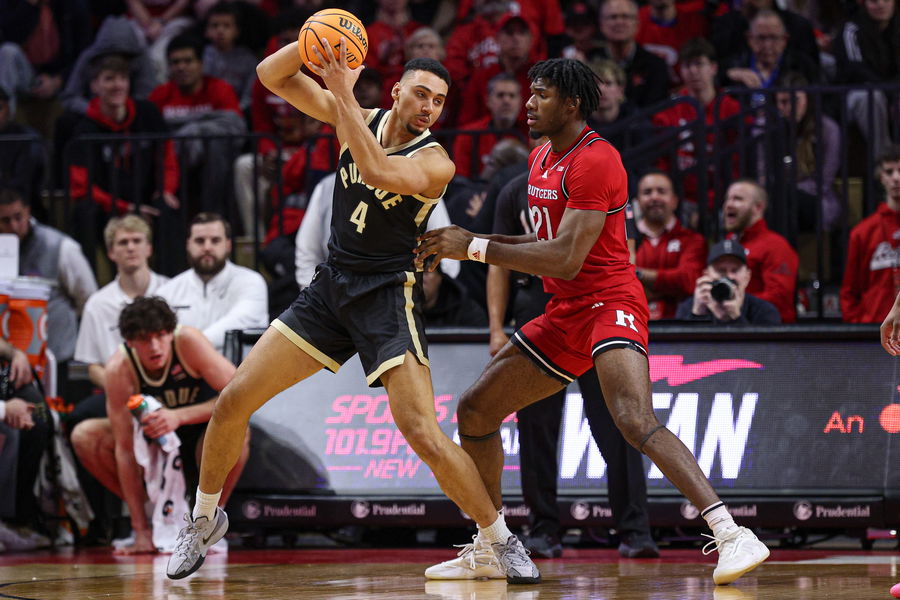 Jan 9, 2025; Piscataway, New Jersey, USA; Purdue Boilermakers forward Trey Kaufman-Renn (4) is guarded by Rutgers Scarlet Knights center Emmanuel Ogbole (21) during the second half at Jersey Mike’s Arena. Mandatory Credit: Vincent Carchietta-Imagn Images