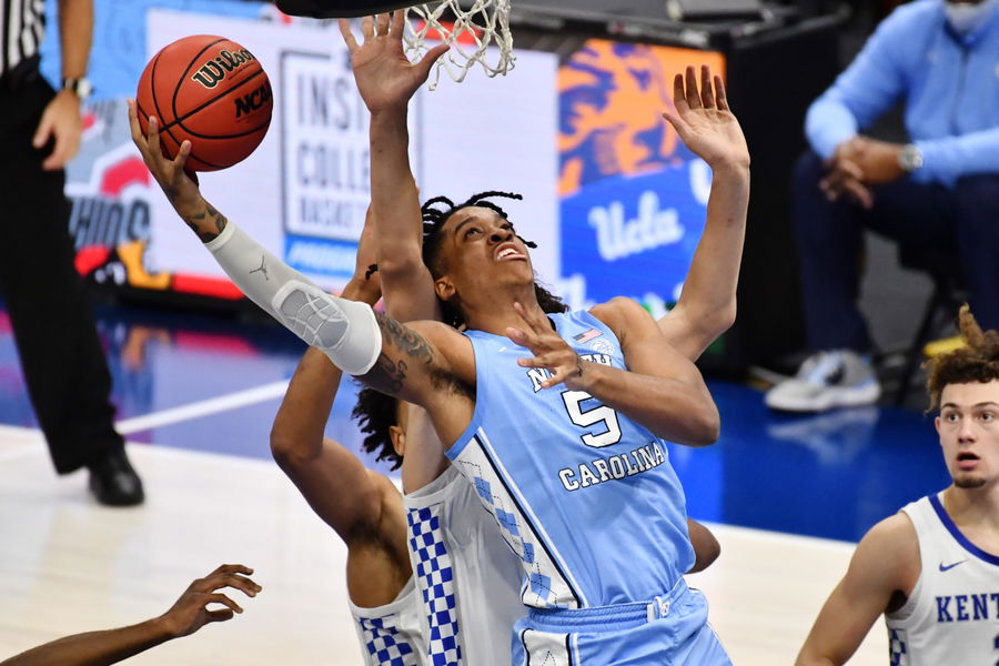 Dec 19, 2020; Cleveland, Ohio, USA; North Carolina Tar Heels forward Armando Bacot (5) drives to the basket against Kentucky Wildcats guard Terrence Clarke (5) during the second half at Rocket Mortgage FieldHouse. Mandatory Credit: Ken Blaze-USA TODAY Sports