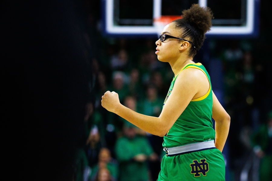 Notre Dame guard Olivia Miles pumps her fist during a NCAA women’s basketball game between No. 8 Notre Dame and No. 2 UConn at Purcell Pavilion on Thursday, Dec. 12, 2024, in South Bend.