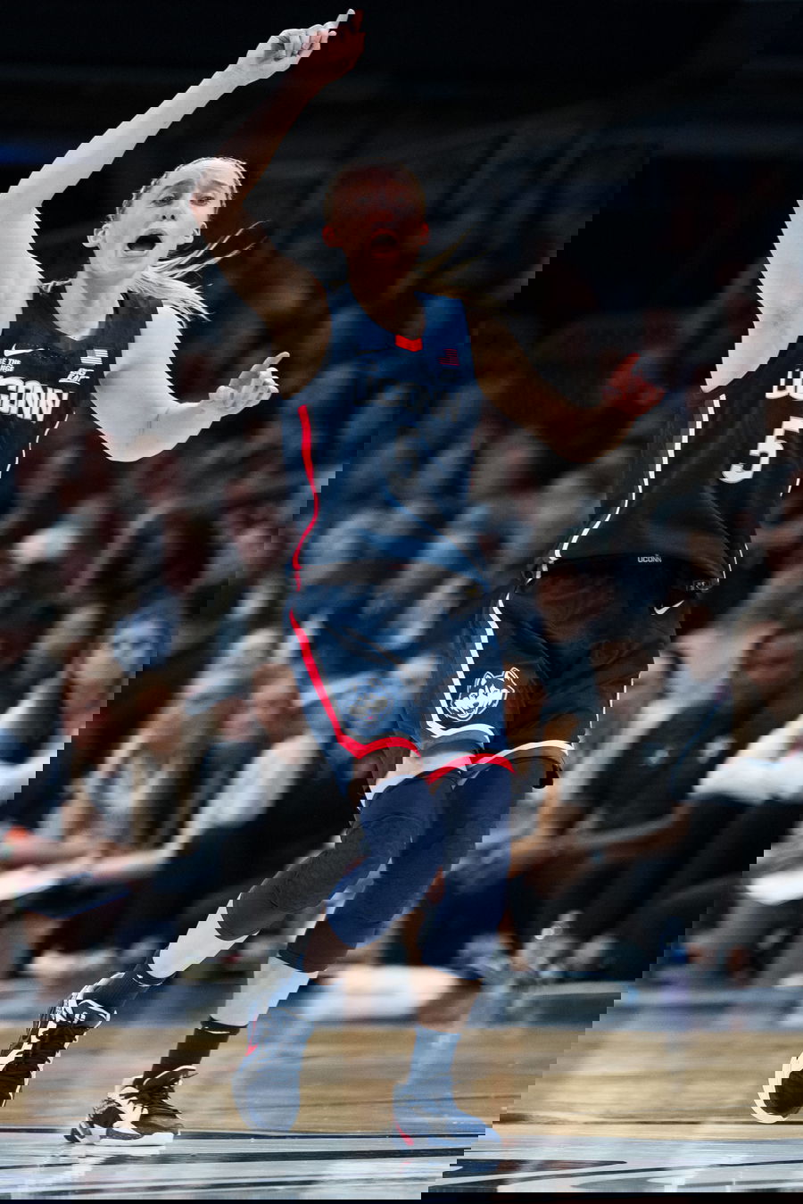 Dec 17, 2024; Uncasville, Connecticut, USA; UConn Huskies guard Paige Bueckers (5) returns up court against the Iowa State Cyclones in the first half at Mohegan Sun Arena. Mandatory Credit: David Butler II-Imagn Images
