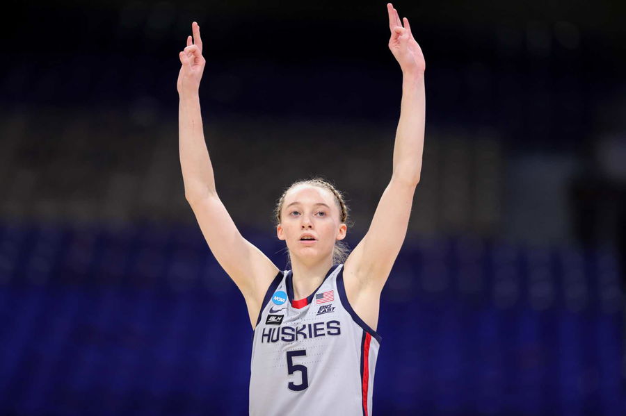 SAN ANTONIO, TEXAS – MARCH 23: Paige Bueckers #5 of the UConn Huskies reacts to a basket against the Syracuse Orange during the second half in the second round game of the 2021 NCAA Women’s Basketball Tournament at the Alamodome on March 23, 2021 in San Antonio, Texas. (Photo by Carmen Mandato/Getty Images)