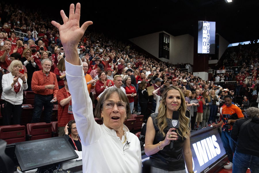 Jan 21, 2024; Stanford, California, USA; Stanford Cardinal head coach Tara VanDerveer acknowledges the cheers of the crowd following her record-breaking 1,203rd collegiate coaching win, a 65-56 victory over the Oregon State Beavers at Maples Pavilion. Mandatory Credit: D. Ross Cameron-USA TODAY Sports