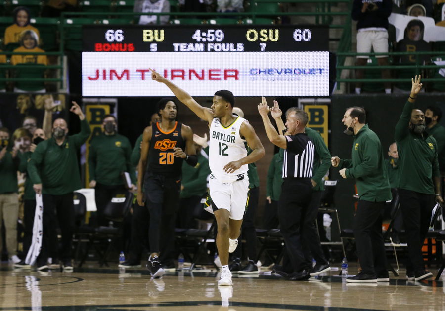 Mar 4, 2021; Waco, Texas, USA; Baylor Bears guard Jared Butler (12) reacts after a made three-point basket against the Oklahoma State Cowboys during the second half at Ferrell Center. Mandatory Credit: Raymond Carlin III-USA TODAY Sports