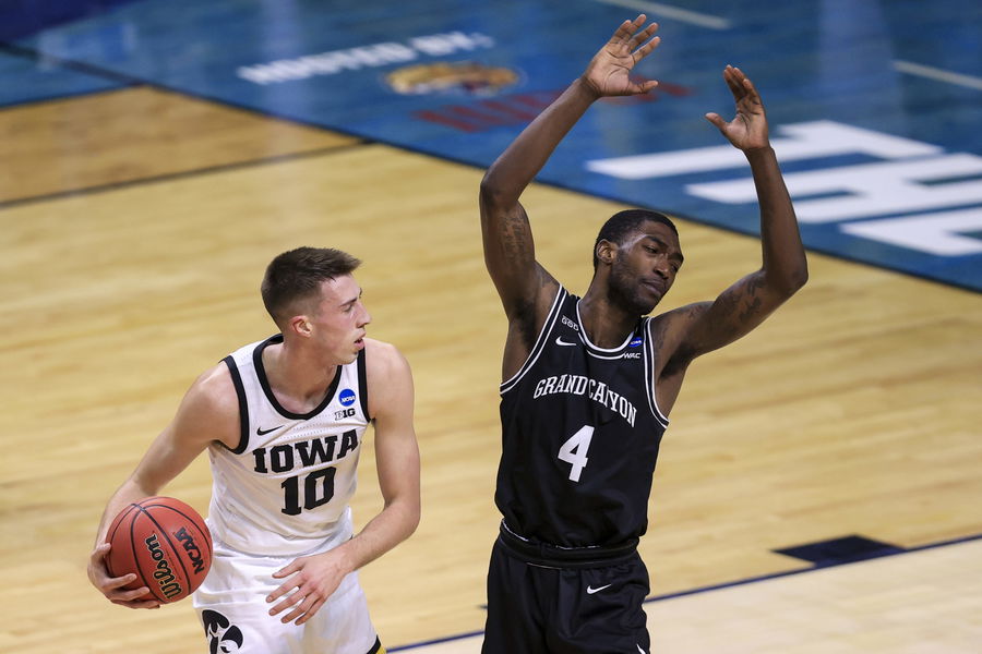 Mar 20, 2021; Indianapolis, IN, USA; Grand Canyon Antelopes forward Oscar Frayer (4) defends against Iowa Hawkeyes guard Joe Wieskamp (10) during the first round of the 2021 NCAA Tournament at Indiana Farmers Coliseum. Mandatory Credit: Aaron Doster-USA TODAY Sports