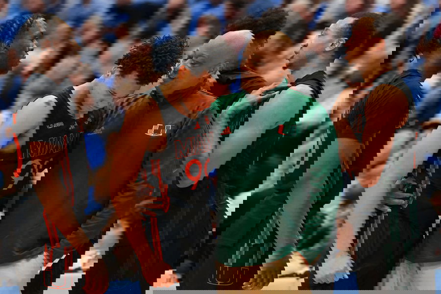 Jan 4, 2025; Blacksburg, Virginia, USA; Miami Hurricanes interim head coach Bill Courtney looks on during the second half against the Virginia Tech Hokies at Cassell Coliseum. Mandatory Credit: Peter Casey-Imagn Images