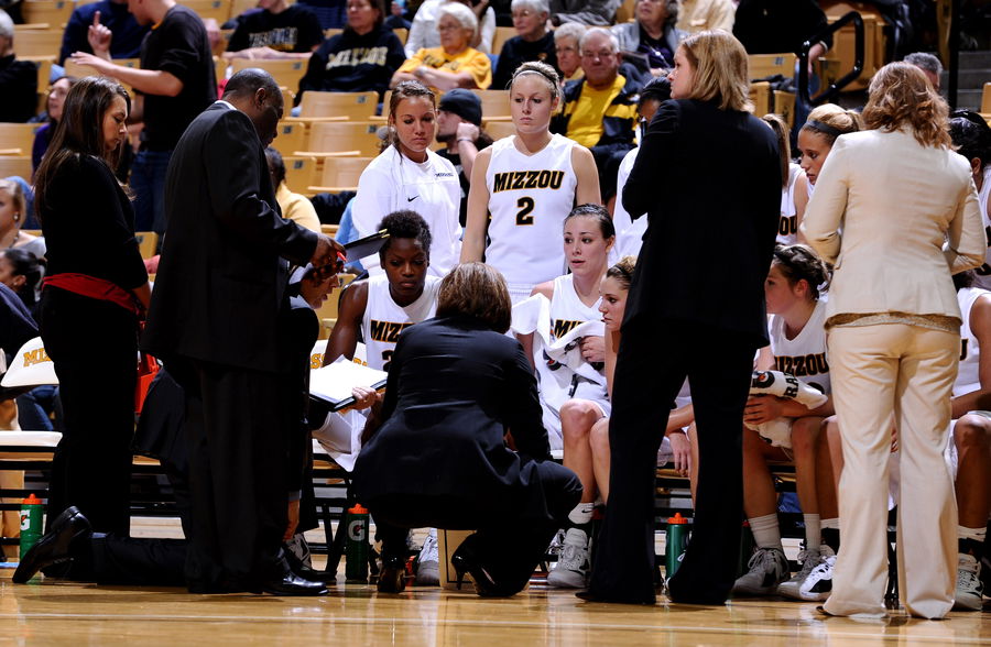 Dec 3, 2011; Columbia, MO, USA; Missouri Tigers head coach Robin Pingeton talks to her players during the second half at Mizzou Arena. Northwestern won 74-70. Mandatory Credit: Dak Dillon-USA TODAY Sports