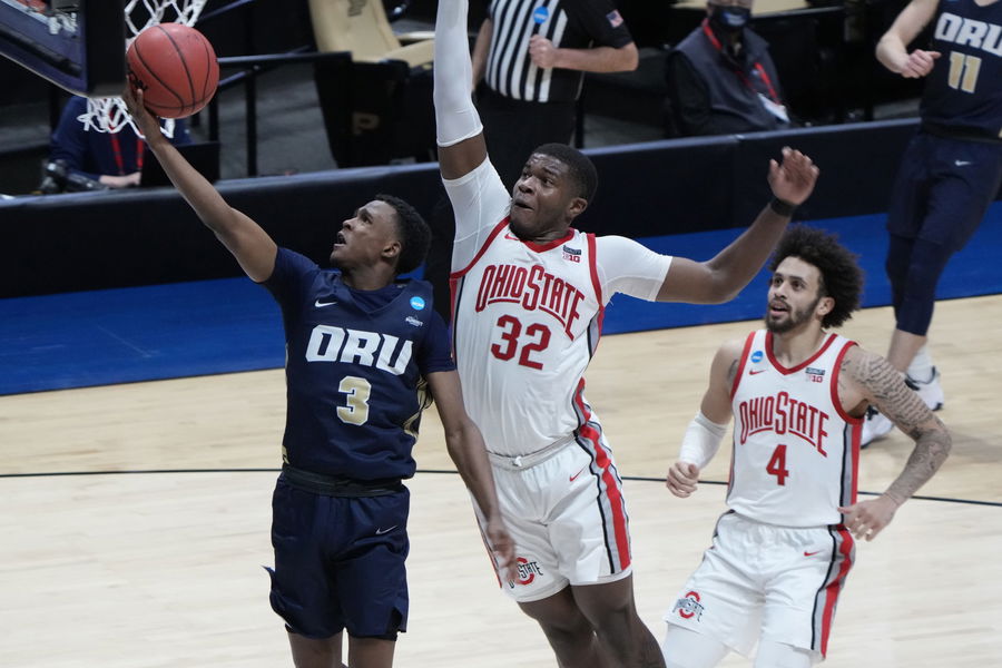 Mar 19, 2021; West Lafayette, Indiana, USA; Oral Roberts Golden Eagles guard Max Abmas (3) shoots the ball against Ohio State Buckeyes forward E.J. Liddell (32) and guard Duane Washington Jr. (4) during the second half in the first round of the 2021 NCAA Tournament at Mackey Arena. Mandatory Credit: Mike Dinovo-USA TODAY Sports