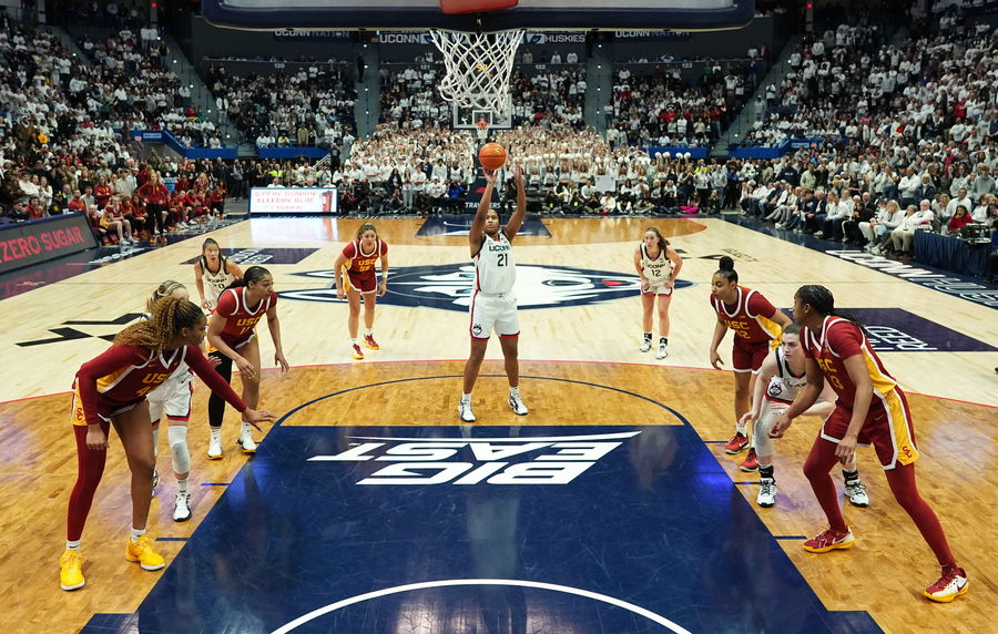 Dec 21, 2024; Hartford, Connecticut, USA; UConn Huskies forward Sarah Strong (21) shoots a free-throw in the final seconds of the game against the USC Trojans in the second half at XL Center. Mandatory Credit: David Butler II-Imagn Images