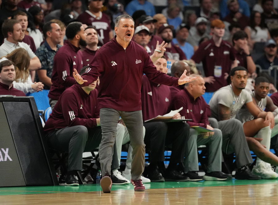 March 21, 2024, Charlotte, NC, USA; Mississippi State Bulldogs head coach Chris Jans reacts against the Michigan State Spartans in the first round of the 2024 NCAA Tournament at the Spectrum Center. Mandatory Credit: Jim Dedmon-USA TODAY Sports