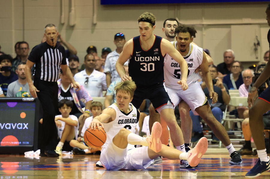 Nov 26, 2024; Lahaina, Hawaii, USA; With seconds left on the clock, Colorado Buffaloes forward Trevor Baskin (6) slips on the court while being guarded by Connecticut Huskies forward Liam McNeeley (30) during the second half of an NCAA college basketball game at Lahaina Civic Center. Mandatory Credit: Marco Garcia-Imagn Images