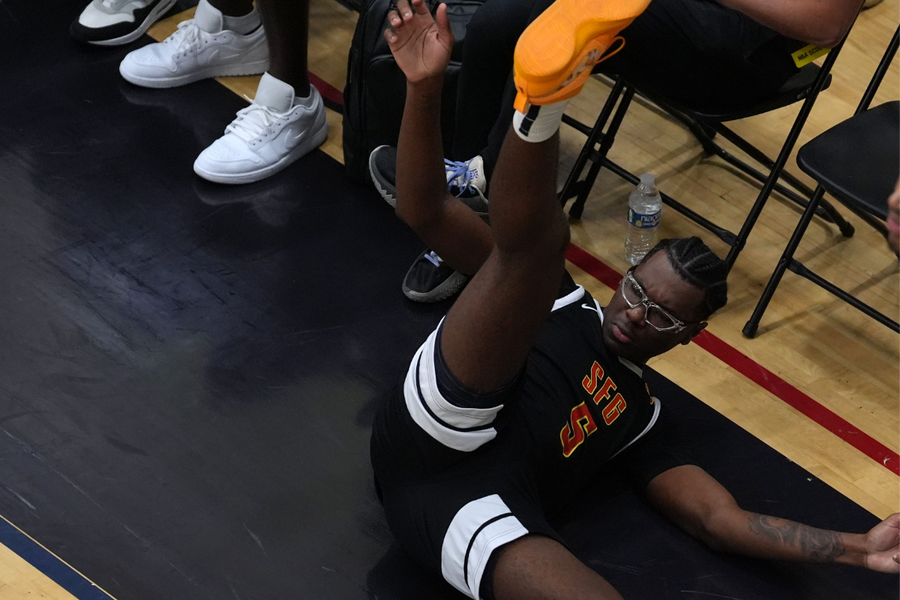 July 17, 2024; North Augusta, S.C., USA; Bryce James (5), son of basketball star LeBron James, slides into the coaches section during the Strive for Greatness (SFG) and Arizona Unity game at the Nike Peach Jam at Riverview Park Activities Center. SFG won 68-66. Mandatory Credit: Katie Goodale-USA TODAY Network