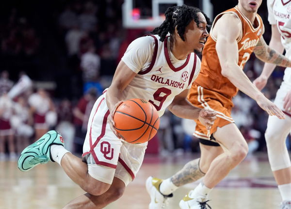 Oklahoma’s Nijel Pack (9) drives to the basket in the second half of the men’s college basketball game between the Oklahoma Sooners and the Texas Longhorns at Lloyd Noble Center in Norman, Okla., Saturday Jan. 31, 2026.