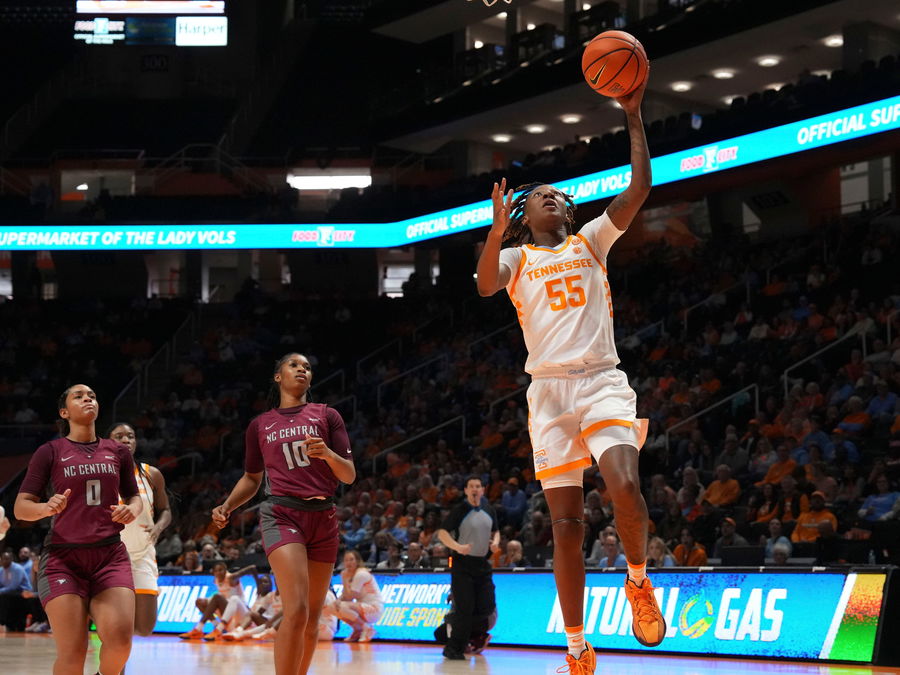 Tennessee’s Talaysia Cooper (55) scores durig the NCAA college basketball game between against North Carolina Central on Saturday, December 14, 2024, in Knoxville, Tenn.