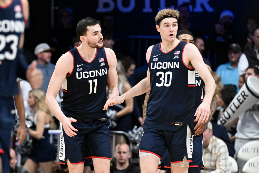 Dec 21, 2024; Indianapolis, Indiana, USA; Connecticut Huskies forward Alex Karaban (11) and forward Liam McNeeley (30) high-five after defeating the Butler Bulldogs at Hinkle Fieldhouse. Mandatory Credit: Robert Goddin-Imagn Images