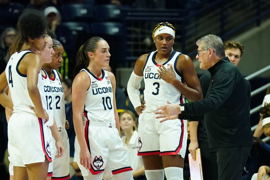 Dec 6, 2023; Storrs, Connecticut, USA; UConn Huskies head coach Geno Auriemma talks to his team from the sideline as they take on the Ball State Cardinals at Harry A. Gampel Pavilion. Mandatory Credit: David Butler II-Imagn Images