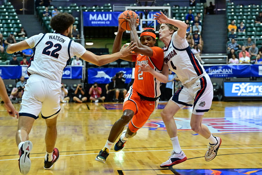 Syracuse Orange guard JJ Starling (2) drives to the basket past Gonzaga Bulldogs forward Anton Watson (22) and guard Dusty Stromer (4) during the first half at SimpliFi Arena at Stan Sheriff Center. Mandatory Credit: Steven Erler-USA TODAY Sports