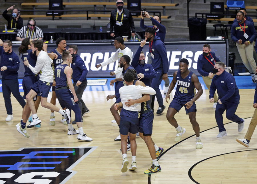 Oral Roberts players celebrate defeating the Ohio State Buckeyes during the first round of the 2021 NCAA Tournament on Friday, March 19, 2021, at Mackey Arena in West Lafayette, Ind. Mandatory Credit: Nikos Frazier/IndyStar via USA TODAY Sports