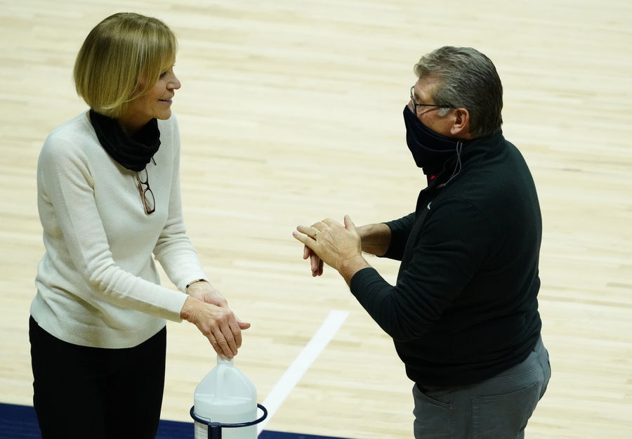 Jan 9, 2021; Storrs, Connecticut, USA; UConn Huskies head coach Geno Auriemma and associate head coach Chris Dailey sanitize their hands before the start of the game against the Providence Friars at Harry A. Gampel Pavilion. Mandatory Credit: David Butler II-USA TODAY Sports