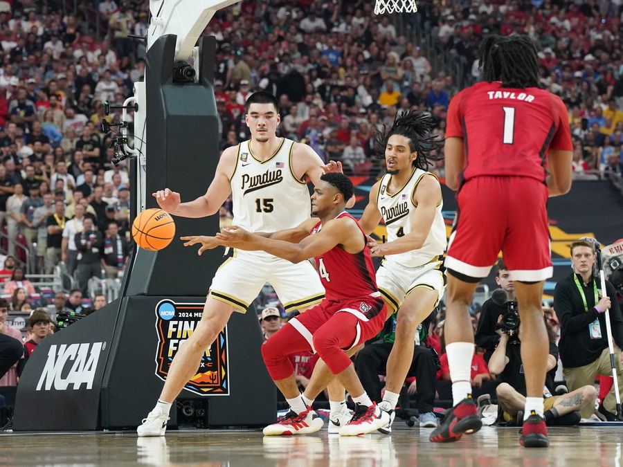 Apr 6, 2024; Glendale, AZ, USA; North Carolina State Wolfpack guard Casey Morsell (14) passes the ball away from Purdue Boilermakers center Zach Edey (15) and Purdue Boilermakers forward Trey Kaufman-Renn (4) in the semifinals of the men’s Final Four of the 2024 NCAA Tournament at State Farm Stadium. Mandatory Credit: Robert Deutsch-USA TODAY Sports