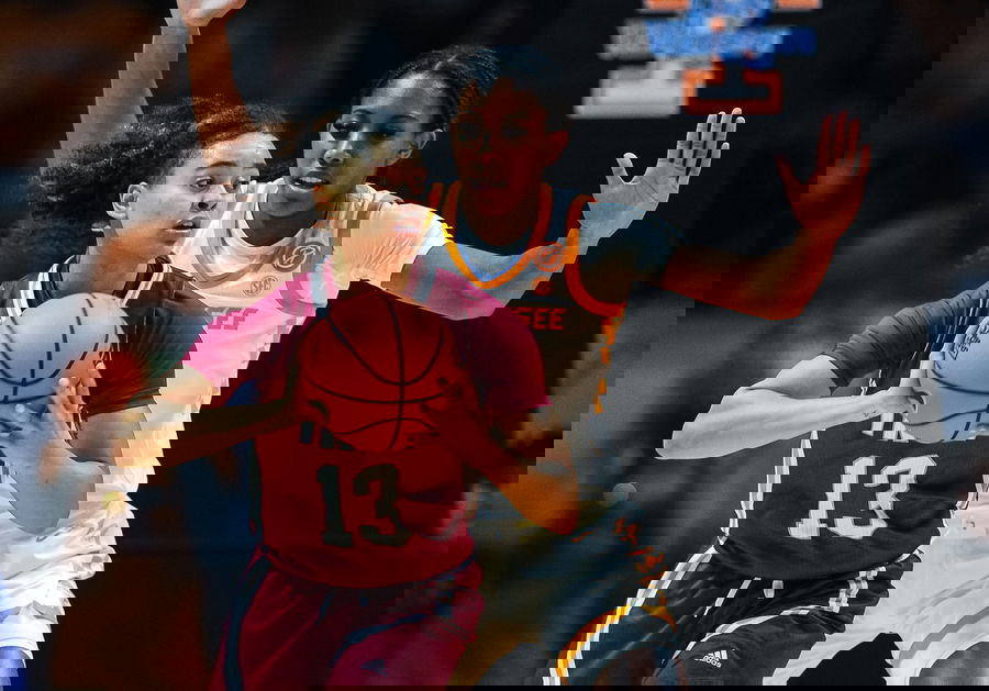KNOXVILLE, TN – NOVEMBER 19: Troy Trojans guard Shaulana Wagner 13 controls the ball against Tennessee Lady Vols guard Kaiya Wynn 5 during a womens college basketball game between the Tennessee Lady Vols and the Troy Trojans on November 19, 2023, at Food City Center, in Knoxville, TN. Photo by Bryan Lynn/Icon Sportswire COLLEGE BASKETBALL: NOV 19 Women s – Troy at Tennessee EDITORIAL USE ONLY Icon20231119015