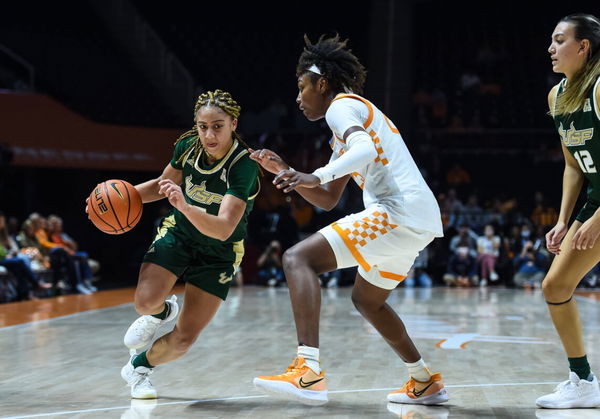 KNOXVILLE, TN – NOVEMBER 15: South Florida Bulls guard Elena Tsineke 5 drives the basketball around Tennessee Lady Vols guard Jordan Horston 25 in a game between the Tennessee Lady Vols and the South Florida Bulls on November 15, 2021, at Thompson-Boling Arena in Knoxville, TN. Photo by Bryan Lynn/Icon Sportswire COLLEGE BASKETBALL: NOV 15 Women s – USF at Tennessee Icon211115034