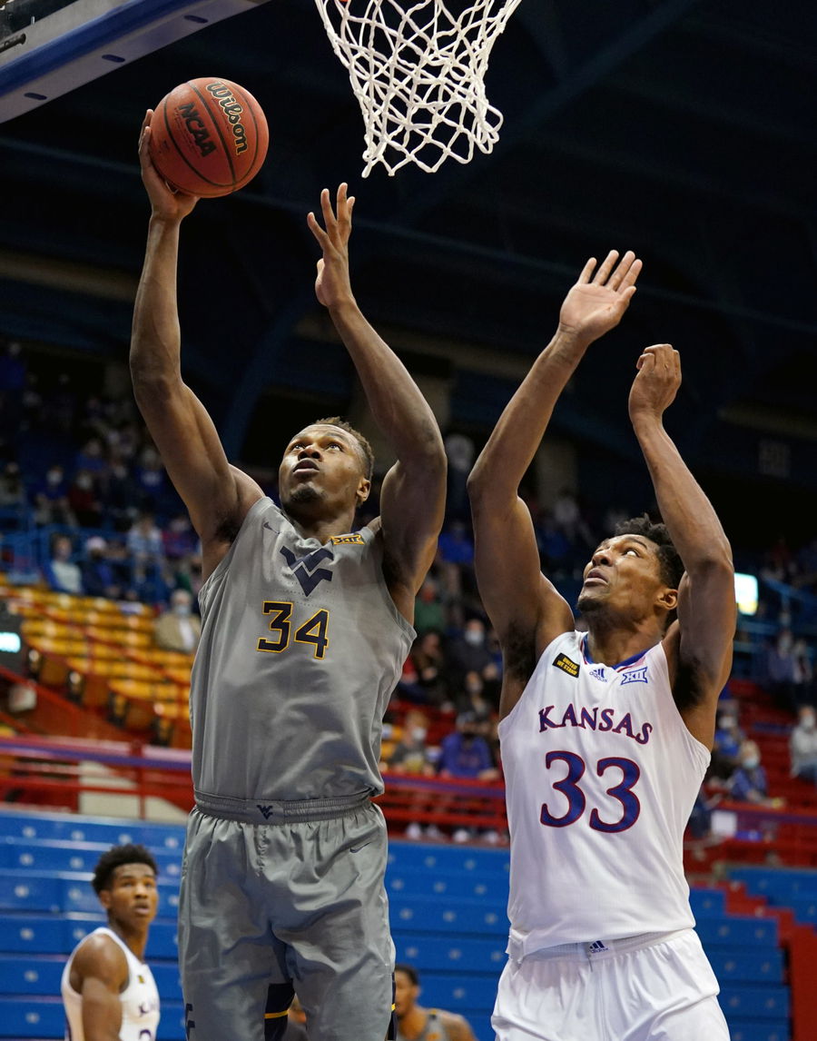 Dec 22, 2020; Lawrence, Kansas, USA; West Virginia Mountaineers forward Oscar Tshiebwe (34) shoots a layup against Kansas Jayhawks forward David McCormack (33) during the second half at Allen Fieldhouse. Mandatory Credit: Denny Medley-USA TODAY Sports