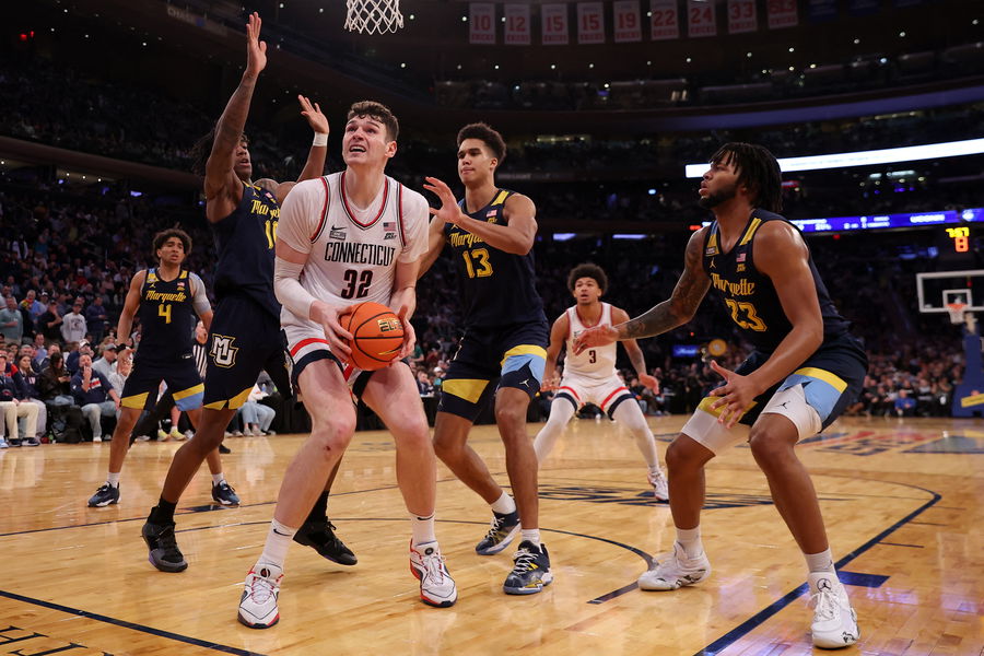 Mar 16, 2024; New York City, NY, USA; Connecticut Huskies center Donovan Clingan (32) looks to shoot the ball against Marquette Golden Eagles guard Zaide Lowery (10) and forward Oso Ighodaro (13) and guard Stevie Mitchell (4) and forward David Joplin (23) during the second half at Madison Square Garden. Mandatory Credit: Brad Penner-USA TODAY Sports