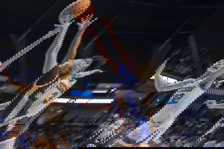 NCAA, College League, USA Womens Basketball: NCAA Tournament Birmingham Regional-Elite 8 Texas vs TCU Mar 31, 2025 Birmingham, AL, USA Texas Longhorns guards Ndjakalenga Mwenentanda 32 and Rori Harmon 3 work against TCU Horned Frogs guard Hailey Van Lith 10 for a rebound during the second half of an Elite 8 NCAA Tournament basketball game at Legacy Arena. Birmingham Legacy Arena AL USA, EDITORIAL USE ONLY PUBLICATIONxINxGERxSUIxAUTxONLY Copyright: xVashaxHuntx 20250331_cec_hd1_101